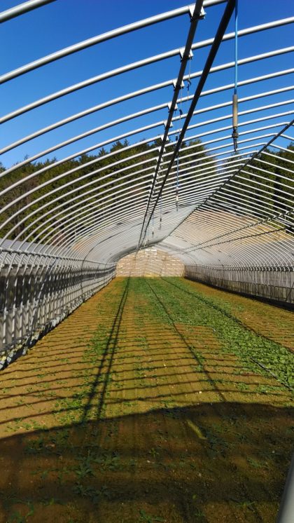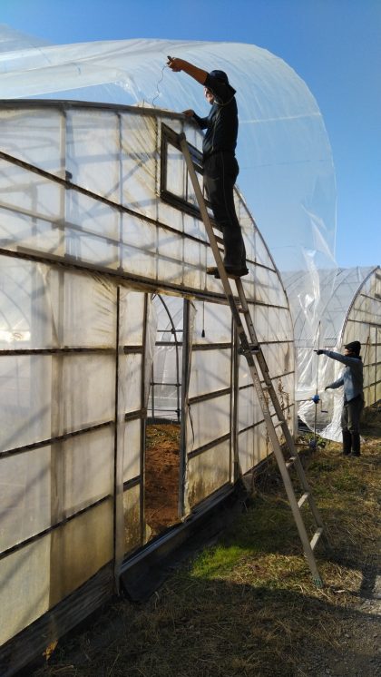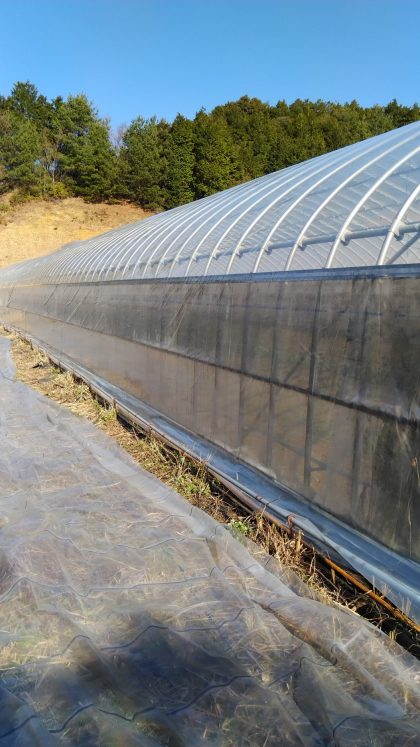 風が強い日に天井ビニールが、破れてしまいました。みんなで張り替えです。この日は、天気もよく風もあまりなかったので、順調にできましたが、ちょっとでも風が吹くとビニールが、飛ばされるので風が止むまで押さえとかないといけません。きれいに張れてひと安心です。