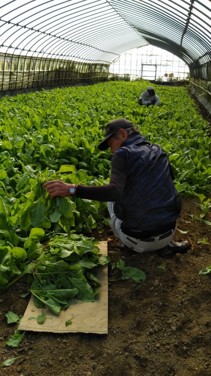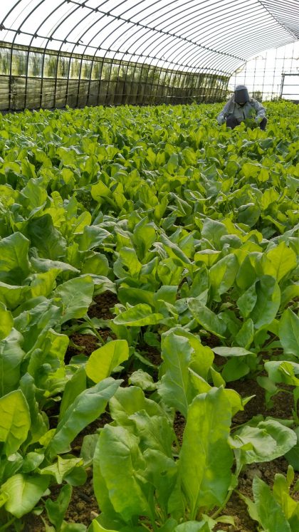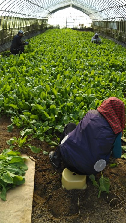 ほうれん草は、基本的に冷涼な気候を好みます。山ほうれん草は、高温に強く、夏の暑い時期にも栽培できる品種です。みなさん暑いなか収穫されています。