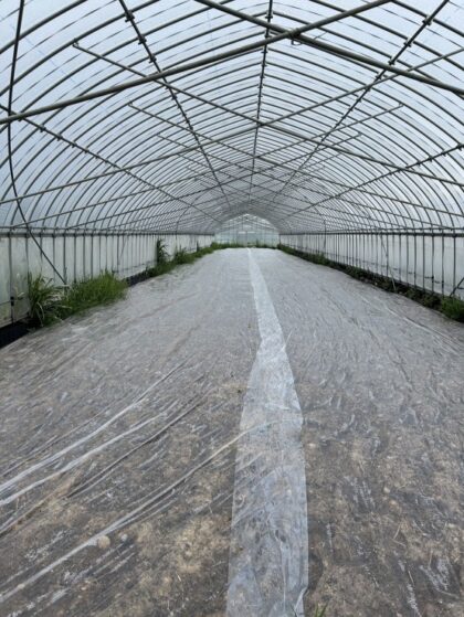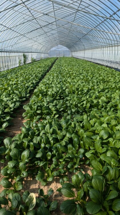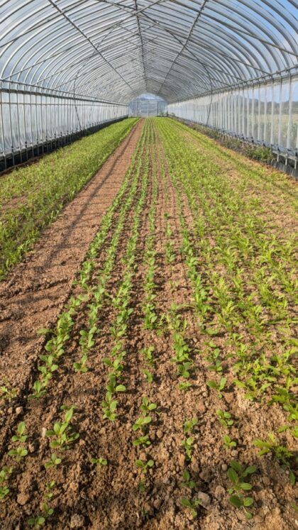 昨年の冬から分場で新しくビニールハウスを2棟建てまして、肥料を大量に投入し、夏の間はずっと太陽熱消毒をして、10月初旬に作付けを開始しました。1作目はだいたい作物の色が抜けてしまったり、発芽が揃わなかったりするんですが今の所は順調そうです。なんとか収穫までキレイなままでいてほしいな〜と、毎日心配しながら観察してます。